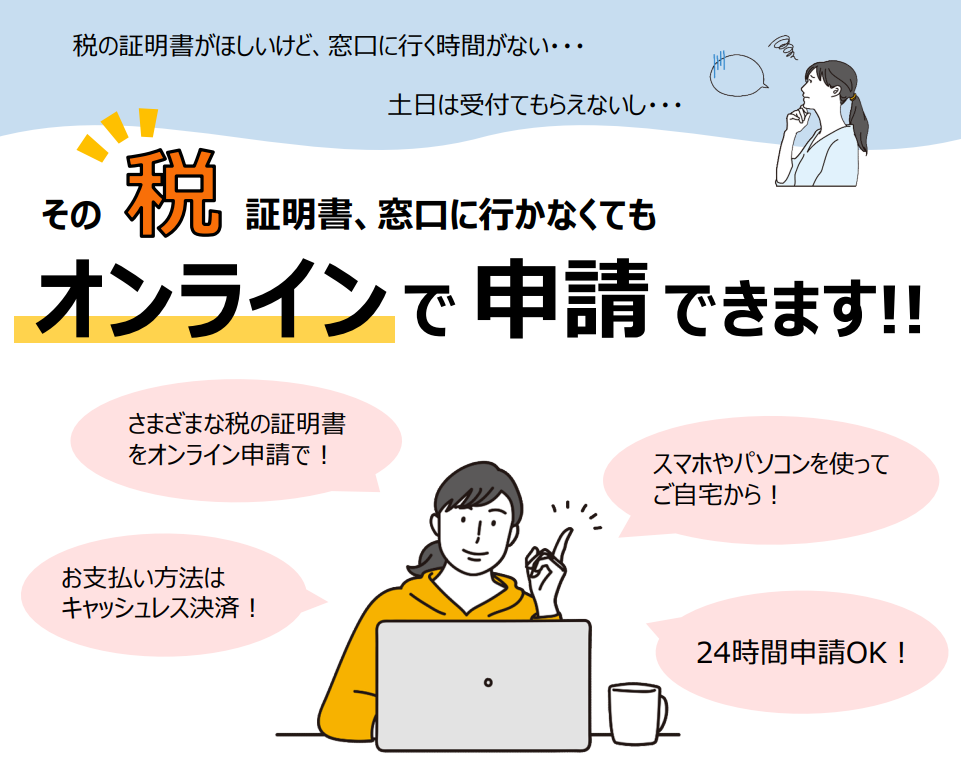 各種税務証明書をスマートフォンやパソコンからオンラインで交付申請することができます。申請していただいた税証明書は郵送しますので、役場への来庁が不要です。